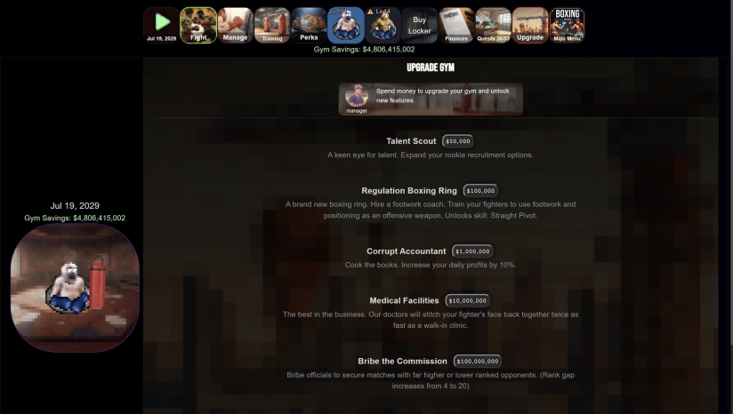 拳馆建设与资源管理:使用比赛奖金升级训练设施、医疗中心与招募系统。管理财务支出,避免因伤病或过度训练导致拳手退役。平衡短期收益与长期发展,构建可持续的冠军梯队。