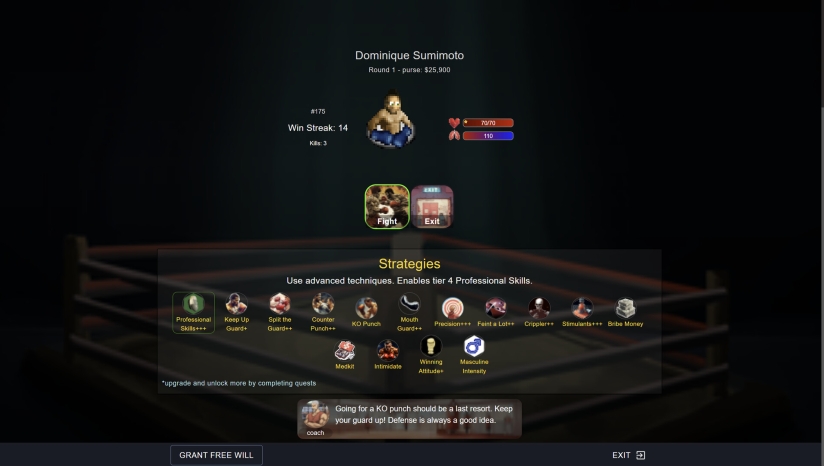 创建你的拳馆:组建一支由不同技能和风格组成的拳手团队。每位拳手都会为拳馆赚取现金。使用现金训练拳手并贿赂拳击委员会。