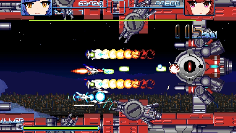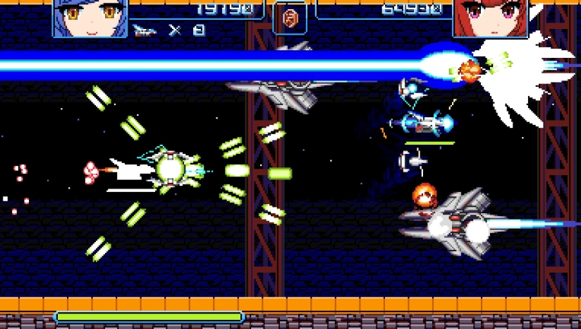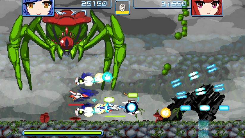 本作是一款正统横版卷轴射击游戏,核心是"超子机系统"(Mega Bit系统)。玩家可以投出子机进行攻击,同时回收能量与道具。能量积攒至最大时可发动"超能爆发",能够消除敌方子弹并对敌人造成巨大伤害。与传统STG不同,游戏考验玩家的多任务处理能力:需要在擦弹闪避、道具回收、能量管理之间灵活切换。被超能爆发击倒的敌人会掉落加分道具,可用于增加残机数或购买新装备。