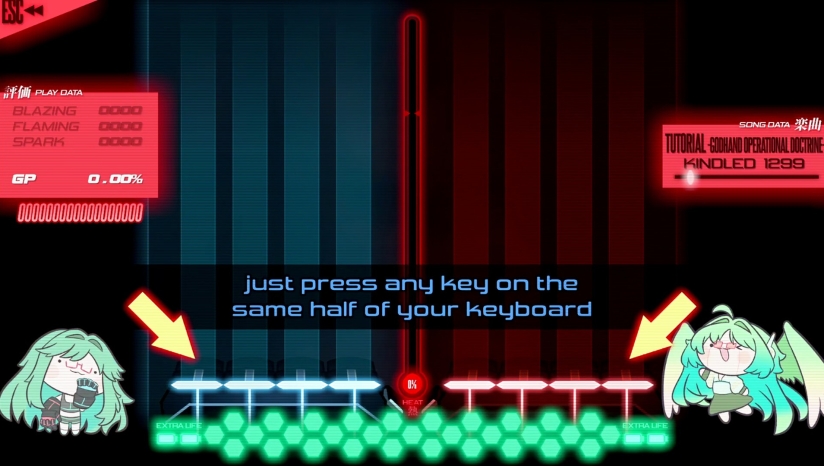 左右分区自由操控,告别指定按键:游戏将键盘分为「左」「右」两大区域,无论按下该侧任意键,均会被识别为对应指令。谱面由左侧四条蓝色轨道与右侧四条红色轨道组成,玩家只需根据提示敲击同侧任意键即可触发判定,极大降低了操作门槛。