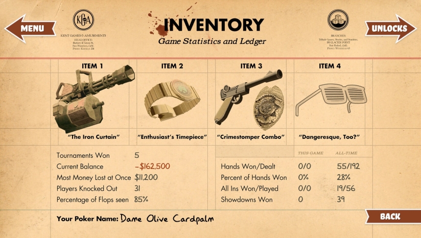 《扑克之夜》(Poker Night at the Inventory)是由Skunkape Games发行的益智类德州扑克游戏。游戏背景设定在一个名为"Inventory"的神秘俱乐部中,玩家将作为第五位参赛者,与来自不同游戏和动漫作品的虚构角色进行牌局对决。这些角色包括《无主之地2》的机械人Claptrap、《军团要塞2》的重装兵Heavy、《萨姆和马克斯》的Max、《Homestar Runner》的Strong Bad以及网络漫画《便宜游乐场》的Tycho等。这种跨IP的角色集结构成了游戏独特的背景设定。