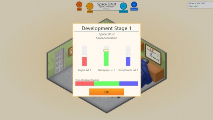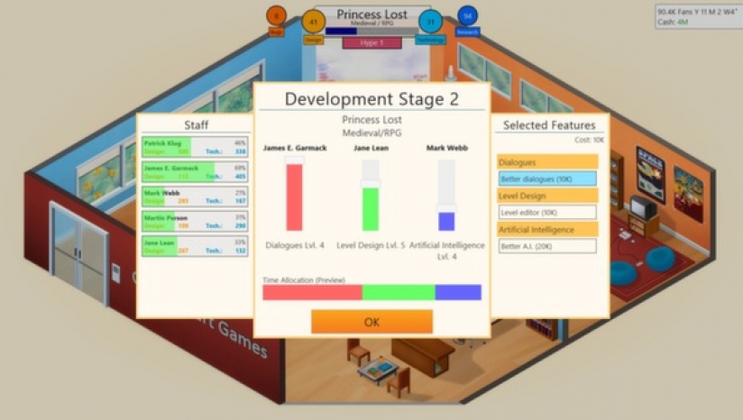 玩家要负责游戏从概念到成品的全过程,包括选择游戏类型、主题、面向的年龄段和平台。在开发过程中,需合理分配技术点和设计点到引擎、游戏性、故事任务等各个阶段。